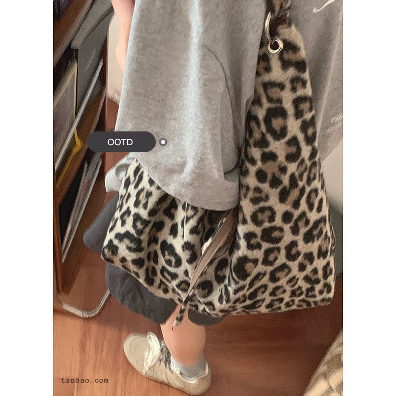 Korean Leopard Print Wool Tote Bag – Trendy Large Capacity Shoulder Bag (Available in 2 Colors)