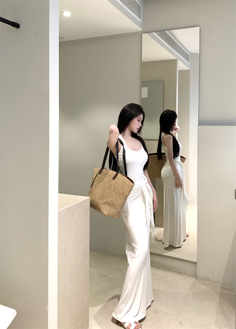 This sleeveless U-neck maxi dress hugs your curves with a slim fit waist and bodycon cut, creating a flattering hourglass shape. Designed with a racerback style and sleek summer-ready fabric, it combines elegance and sexiness for both daytime chic and evening allure. Perfect for women who love Korean-inspired fashion, this dress is your go-to for parties, date nights, or casual summer outings.