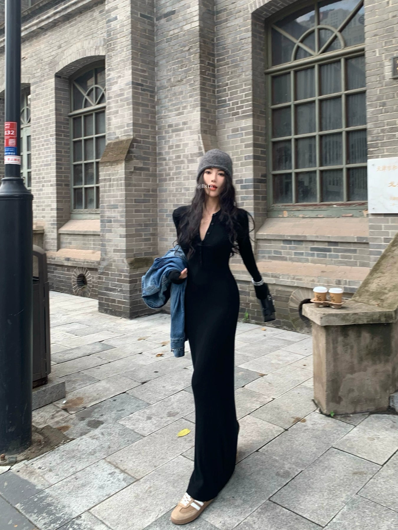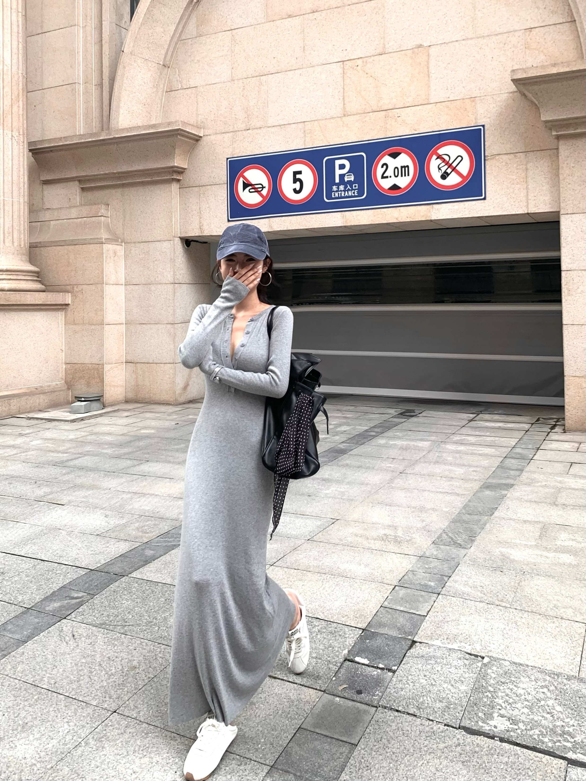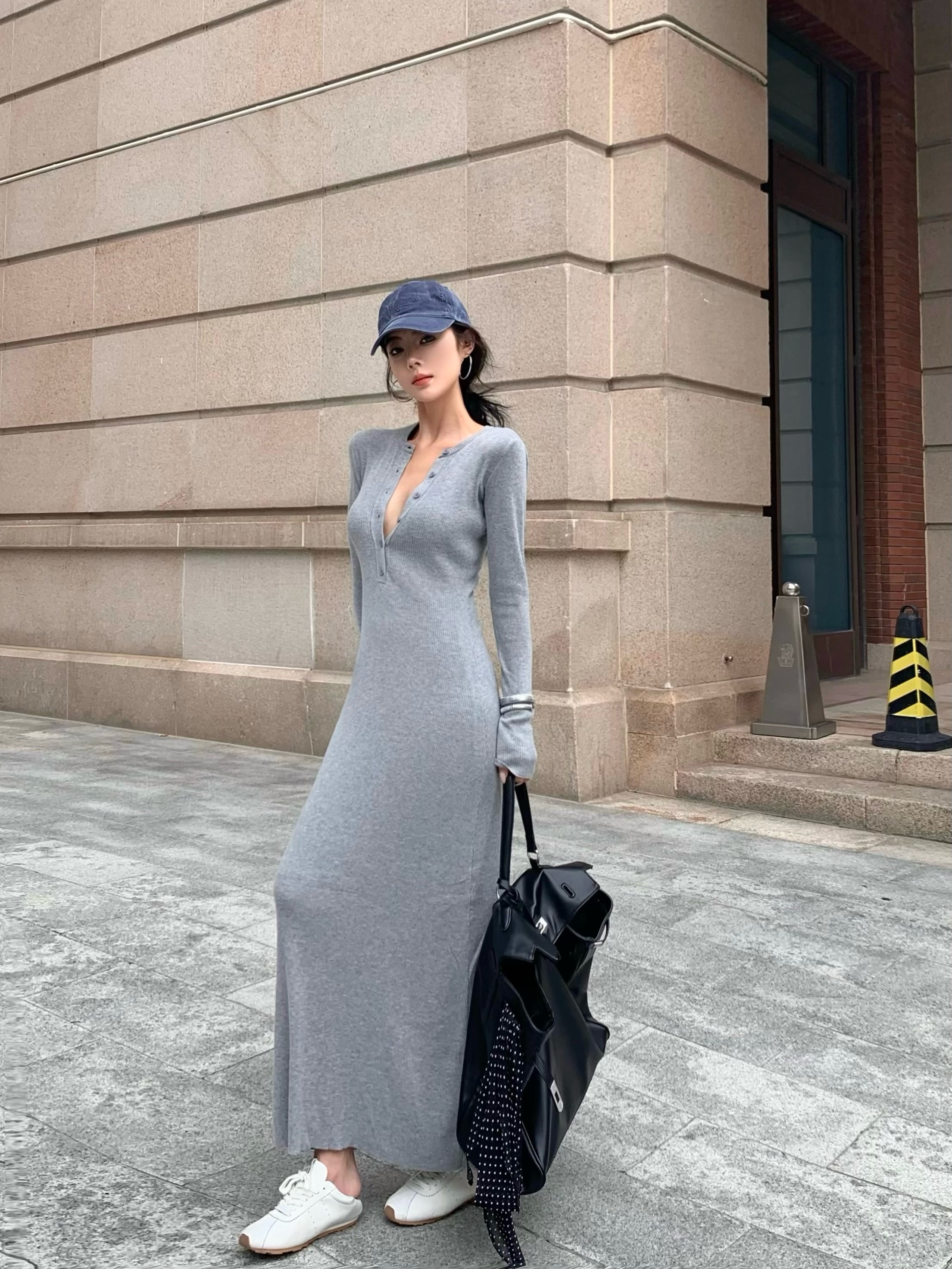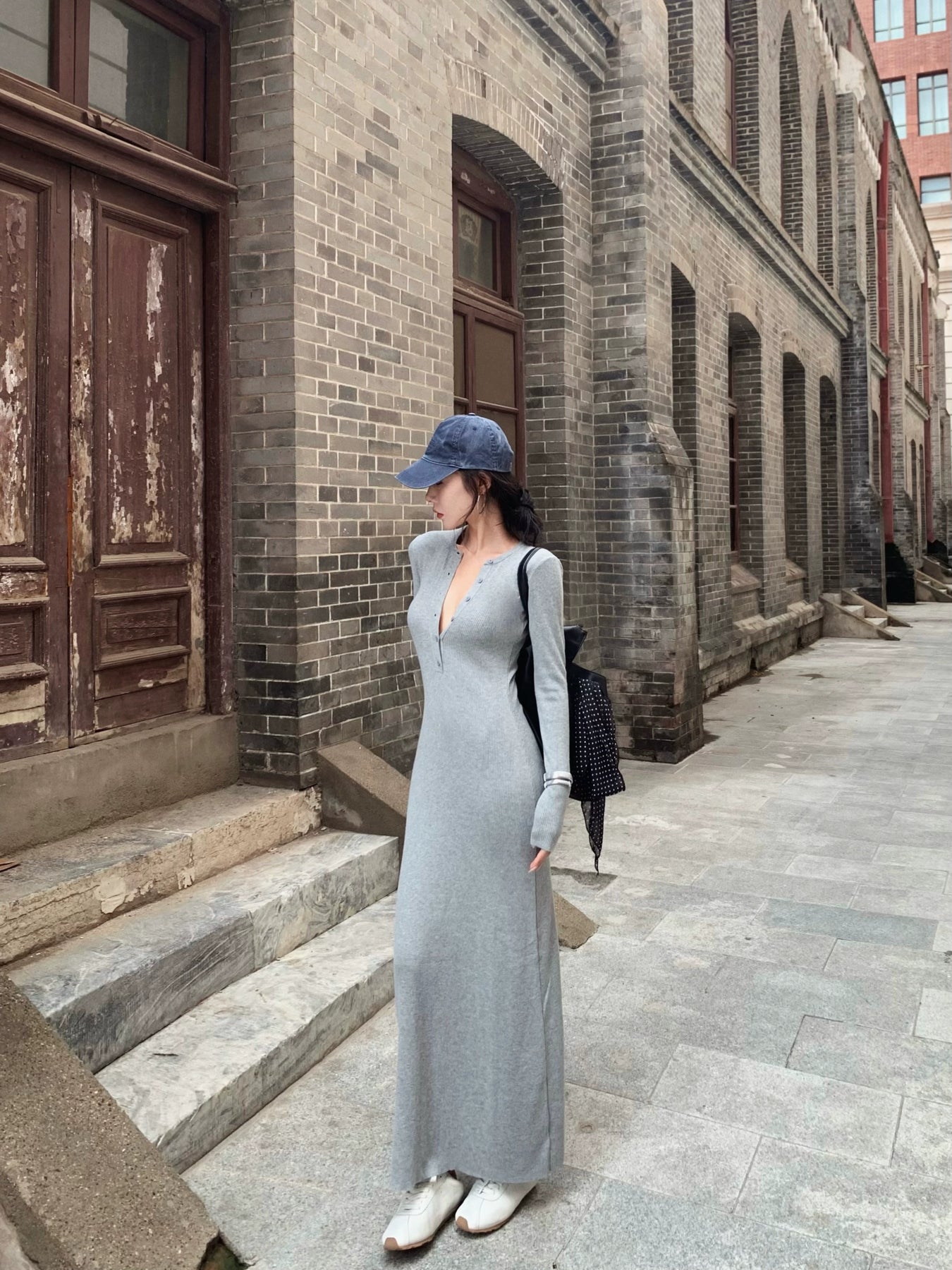 Step into sophistication with this gray knit long sleeve maxi dress. Crafted with a soft, stretchy ribbed fabric, it hugs your curves in all the right places while maintaining a sleek, refined silhouette. The half-open neckline adds a subtle touch of allure, perfectly balancing elegance and sensuality. Whether for casual outings, date nights, or evening events, this dress embodies Korean-inspired “pure desire” minimalism with timeless charm.