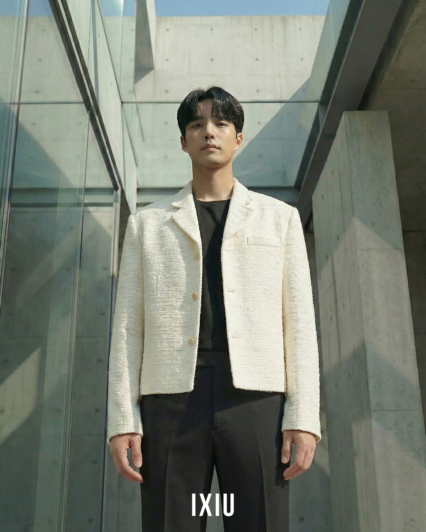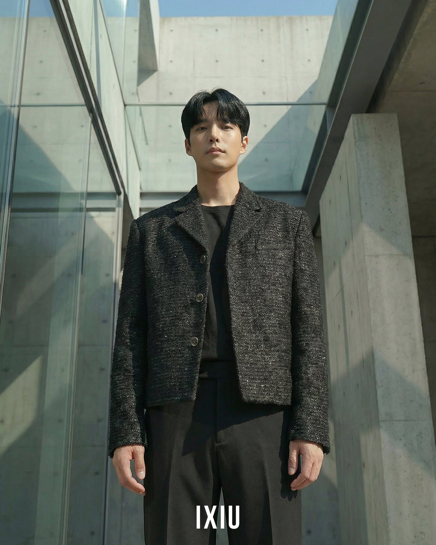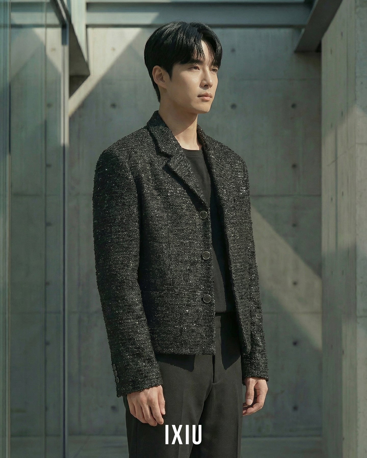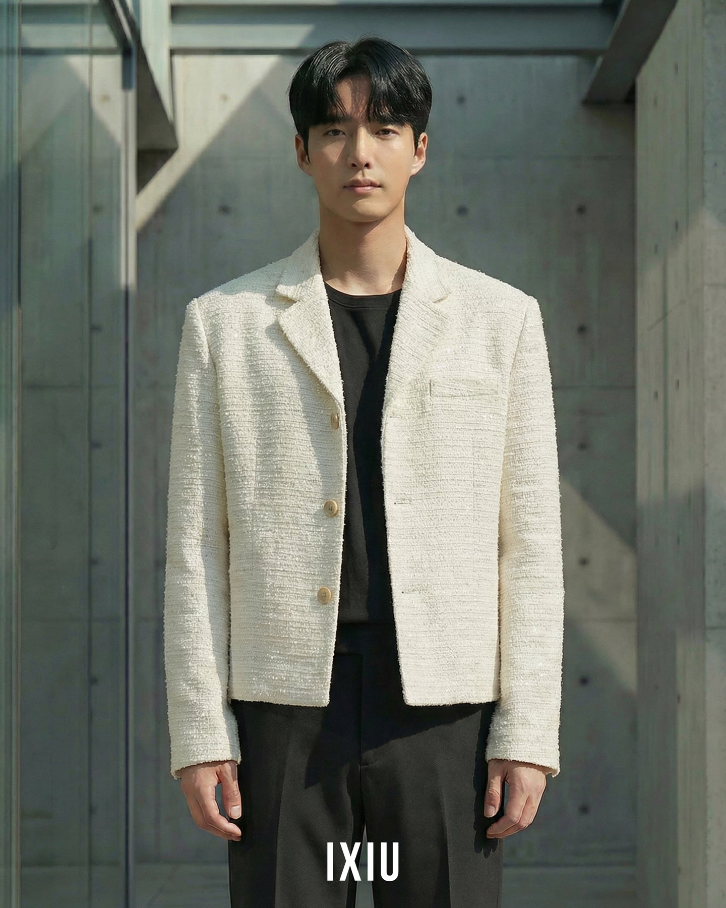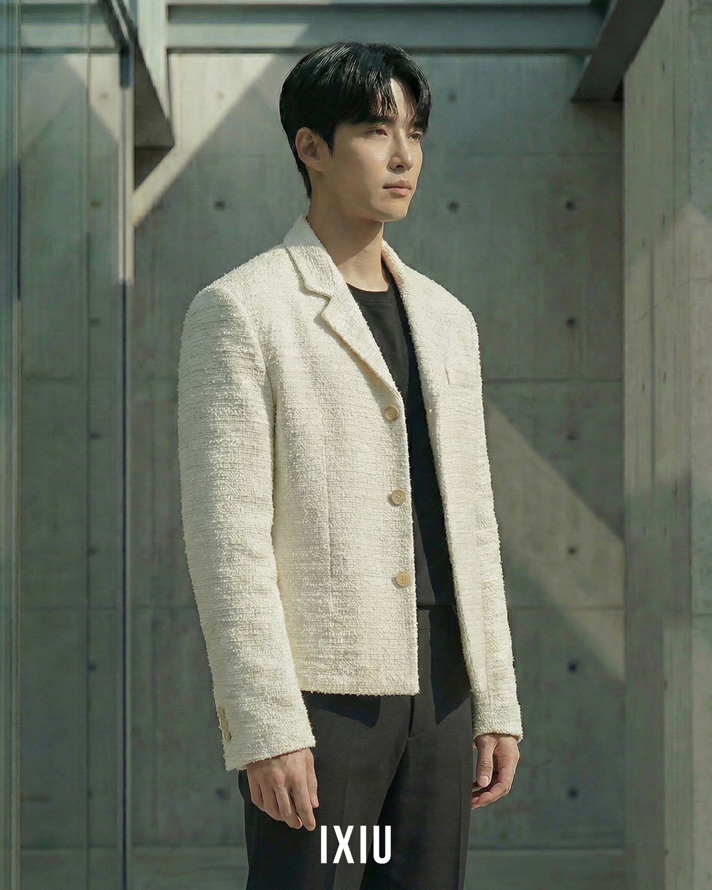 2026年春、最も注目されるツイード素材を採用したノーカラーブルゾン。 20代後半の男性に向けた、クラシックとモダンが融合した「IXIU」を象徴する一着です。