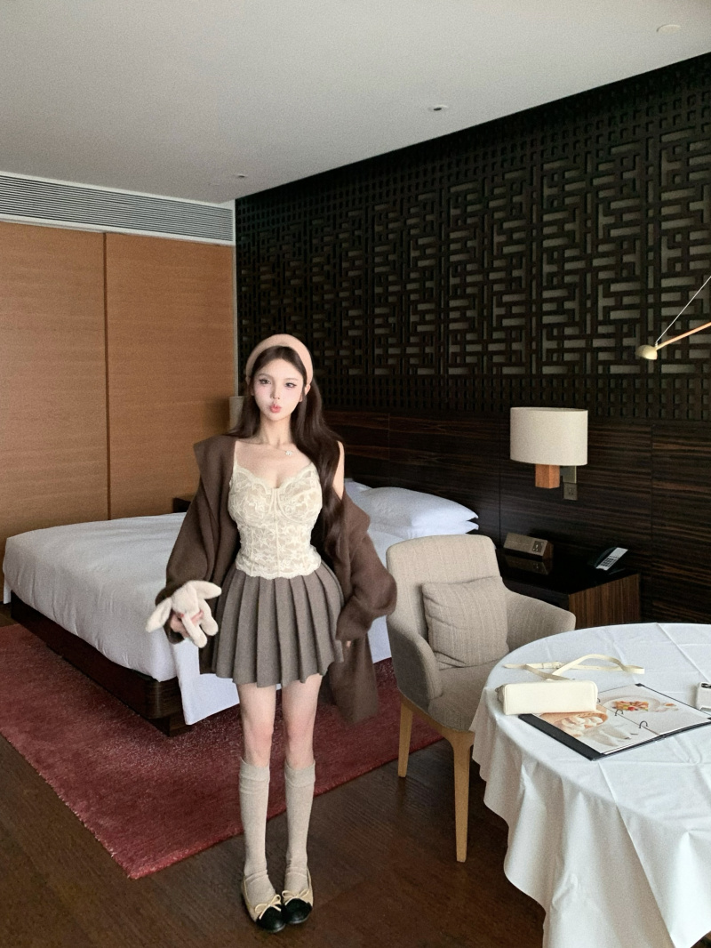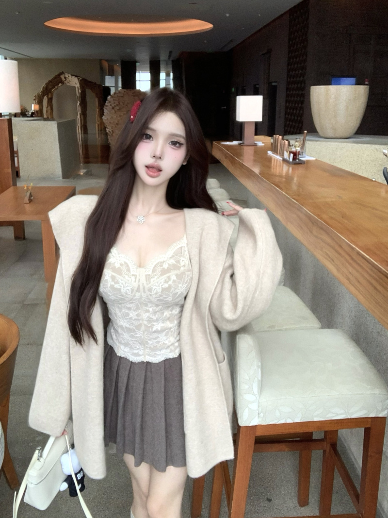 This three-piece knit set includes a loose-fit hooded cardigan, a stretch cami, and a matching mini skirt. The soft-touch knit feels warm yet lightweight—perfect for early autumn days or air-conditioned interiors. The cardigan drapes effortlessly for a relaxed Korean “lazy chic” vibe, while the fitted cami and skirt balance it with a feminine silhouette. Pair the set together for an easy coordinated look, or mix and match for endless styling options.