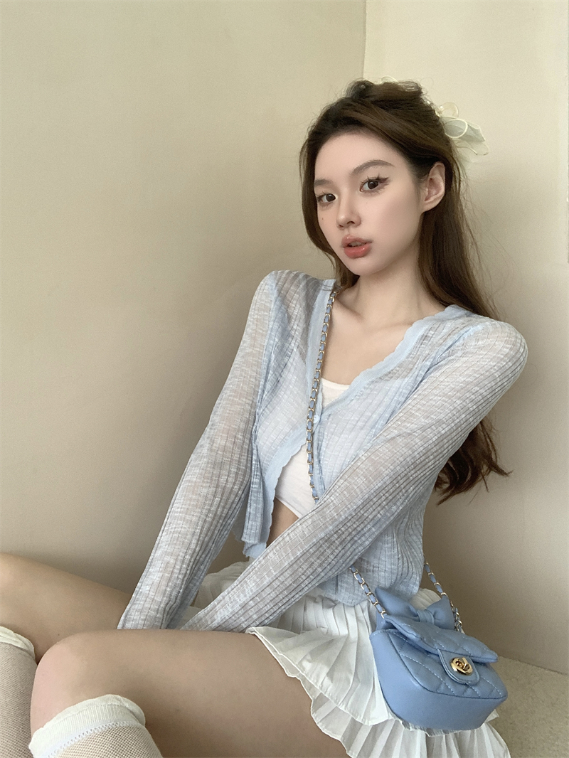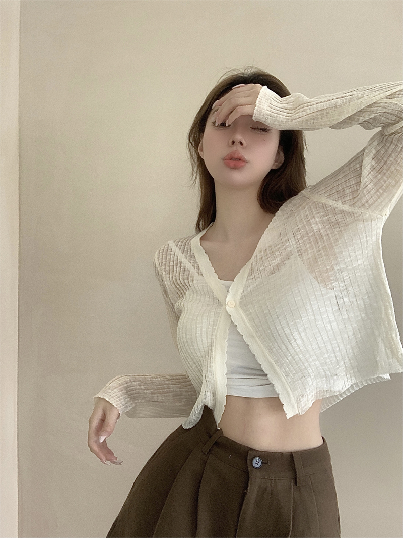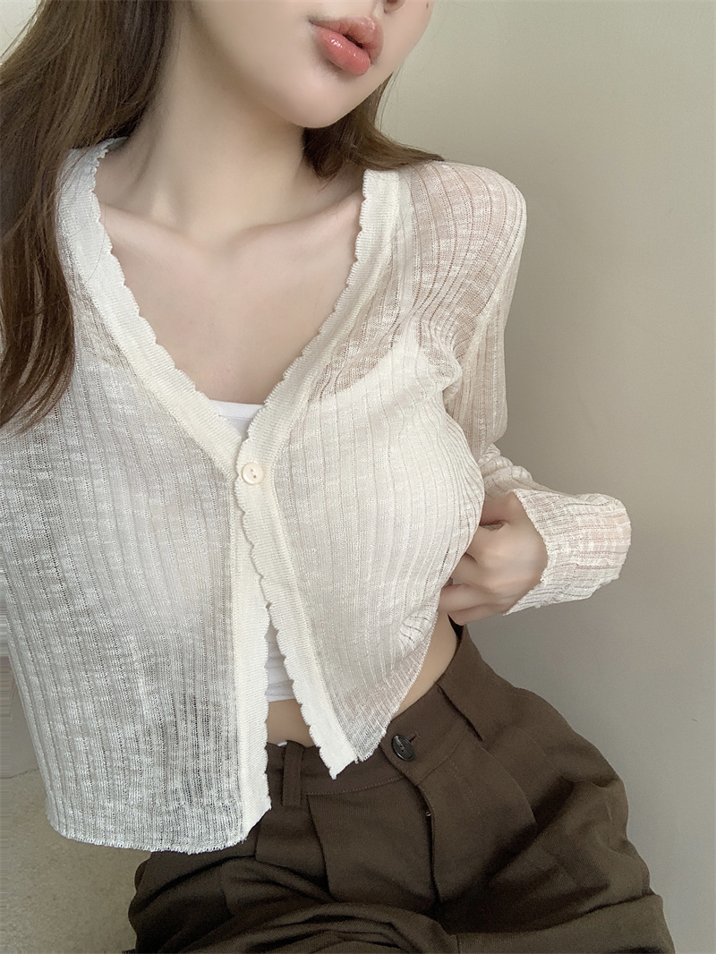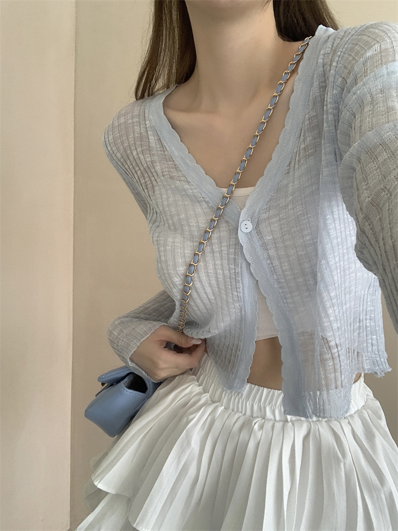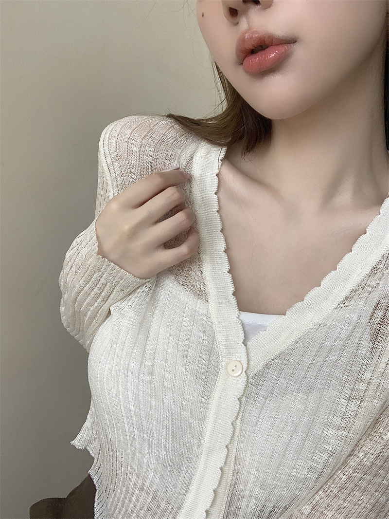 This airy V-neck knit cardigan is designed for summer and early fall layering. Made from a soft, slightly sheer knit, it offers just the right amount of sun protection without feeling heavy. The relaxed silhouette, subtle transparency, and delicate texture give it that “soft Korean aesthetic” charm—perfect to wear over camis, dresses, or crop tops. Ideal for everyday wear, travel, or seaside evenings.