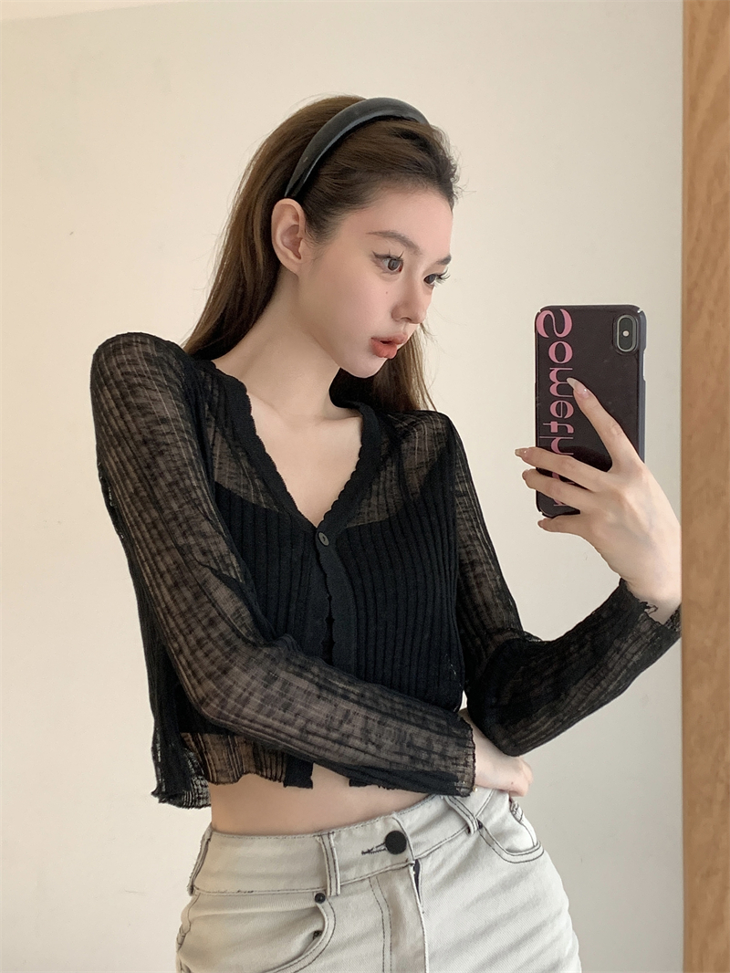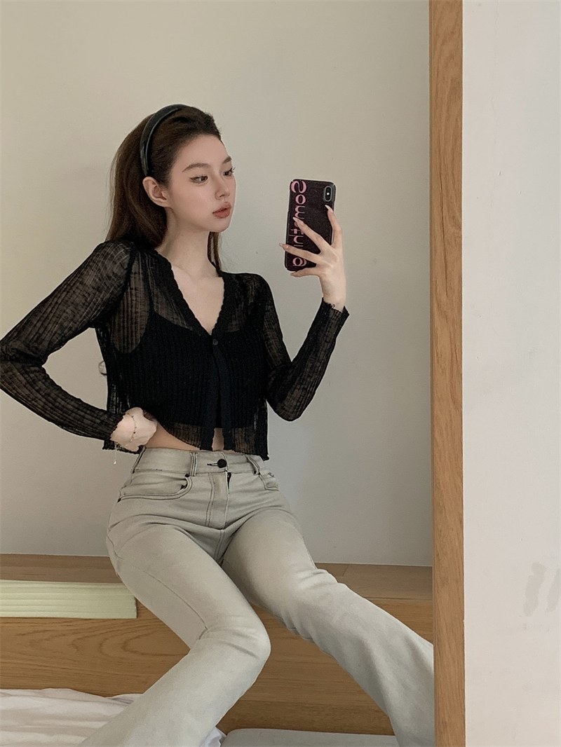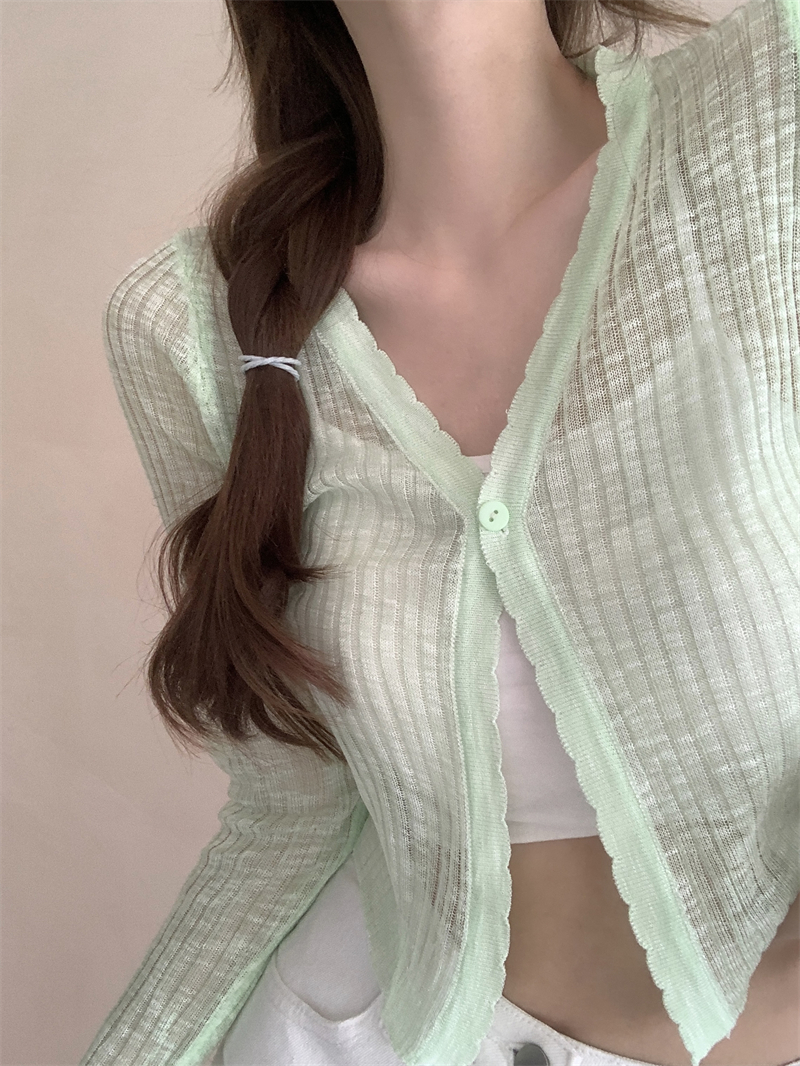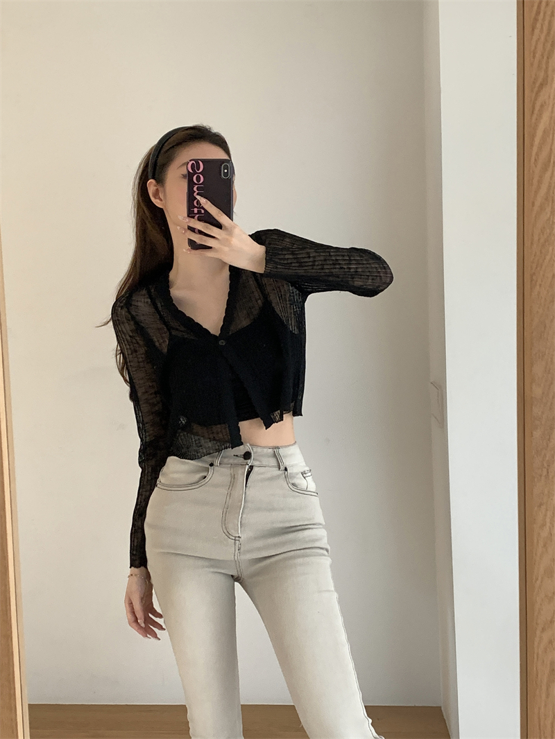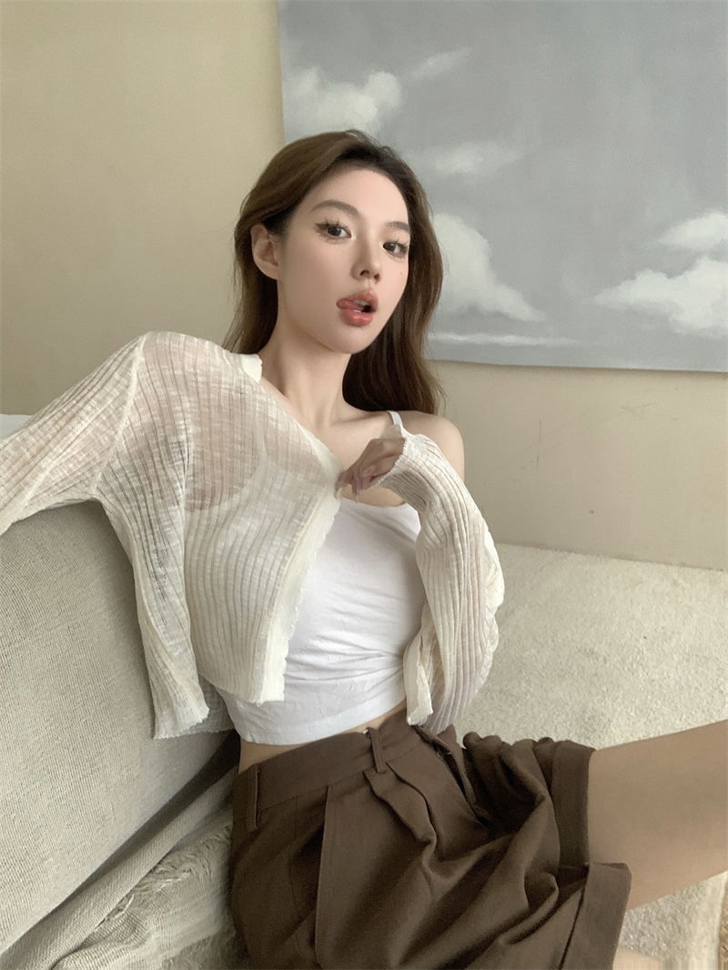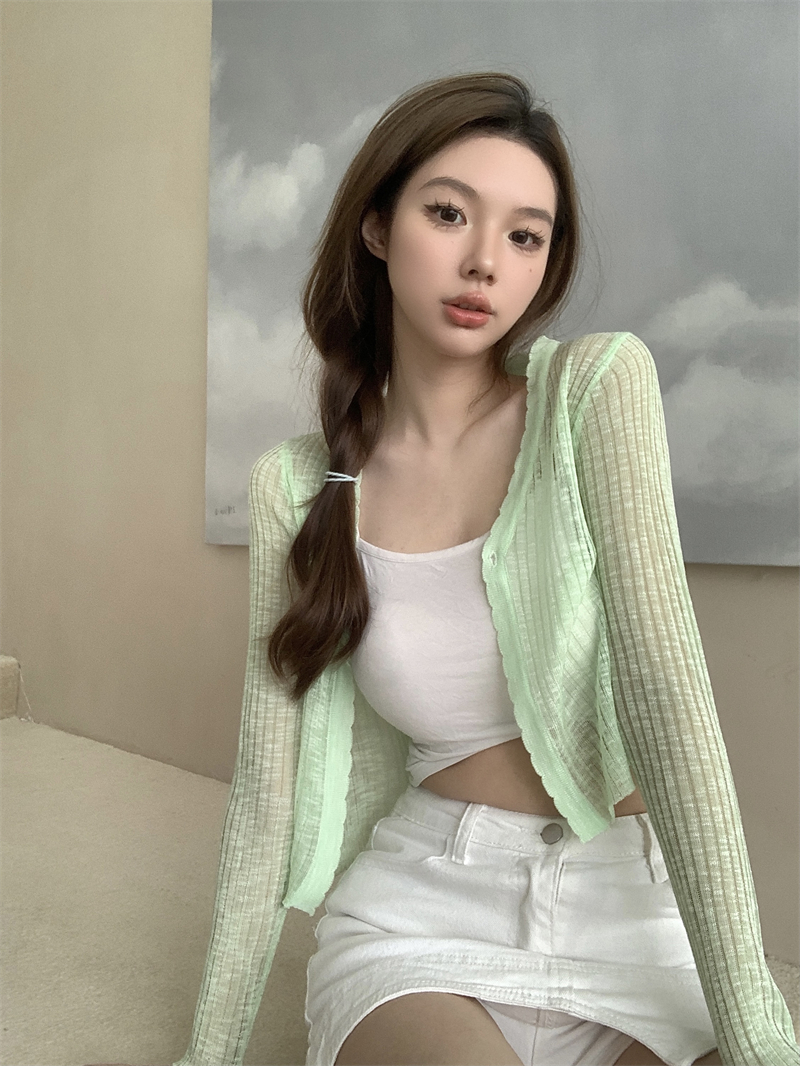 This airy V-neck knit cardigan is designed for summer and early fall layering. Made from a soft, slightly sheer knit, it offers just the right amount of sun protection without feeling heavy. The relaxed silhouette, subtle transparency, and delicate texture give it that “soft Korean aesthetic” charm—perfect to wear over camis, dresses, or crop tops. Ideal for everyday wear, travel, or seaside evenings.