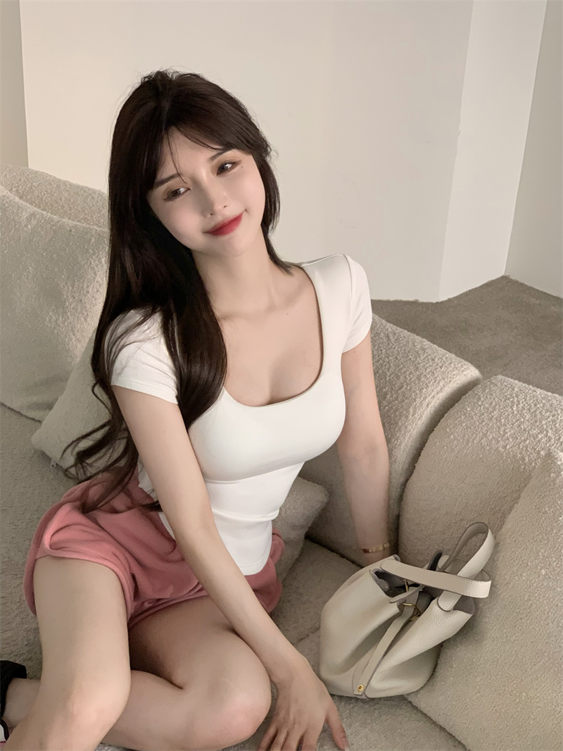 Turn heads with this U-shaped square neck short sleeve top that perfectly blends simplicity and sensuality. The curved hemline enhances your waistline, creating a flattering hourglass silhouette. Crafted from soft, stretchable fabric, it offers a comfortable slim fit that moves with your body. Inspired by Korean “pure desire” aesthetics, this white fitted tee brings a clean yet seductive vibe—ideal for both casual and elevated looks.