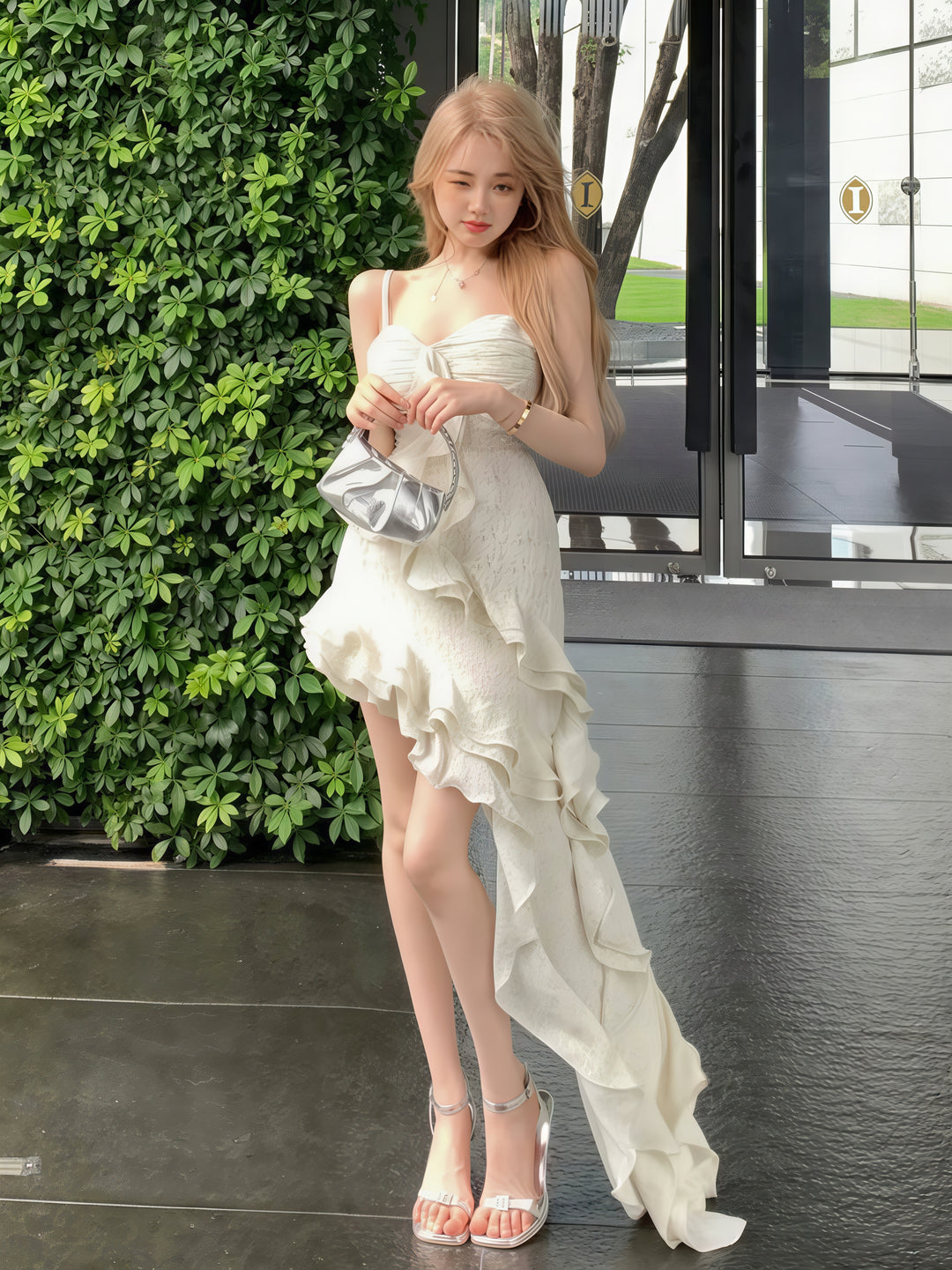 甜美性感荷叶边花卉长裙 - 女士不对称夏季海滩吊带裙