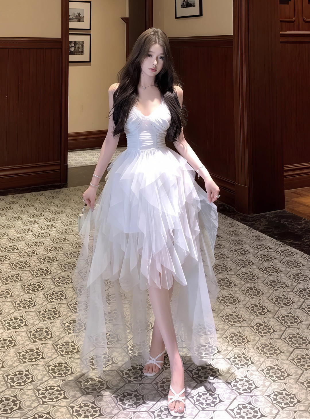 法国白色网纱吊带长裙 – 优雅A字腰部修身礼服
