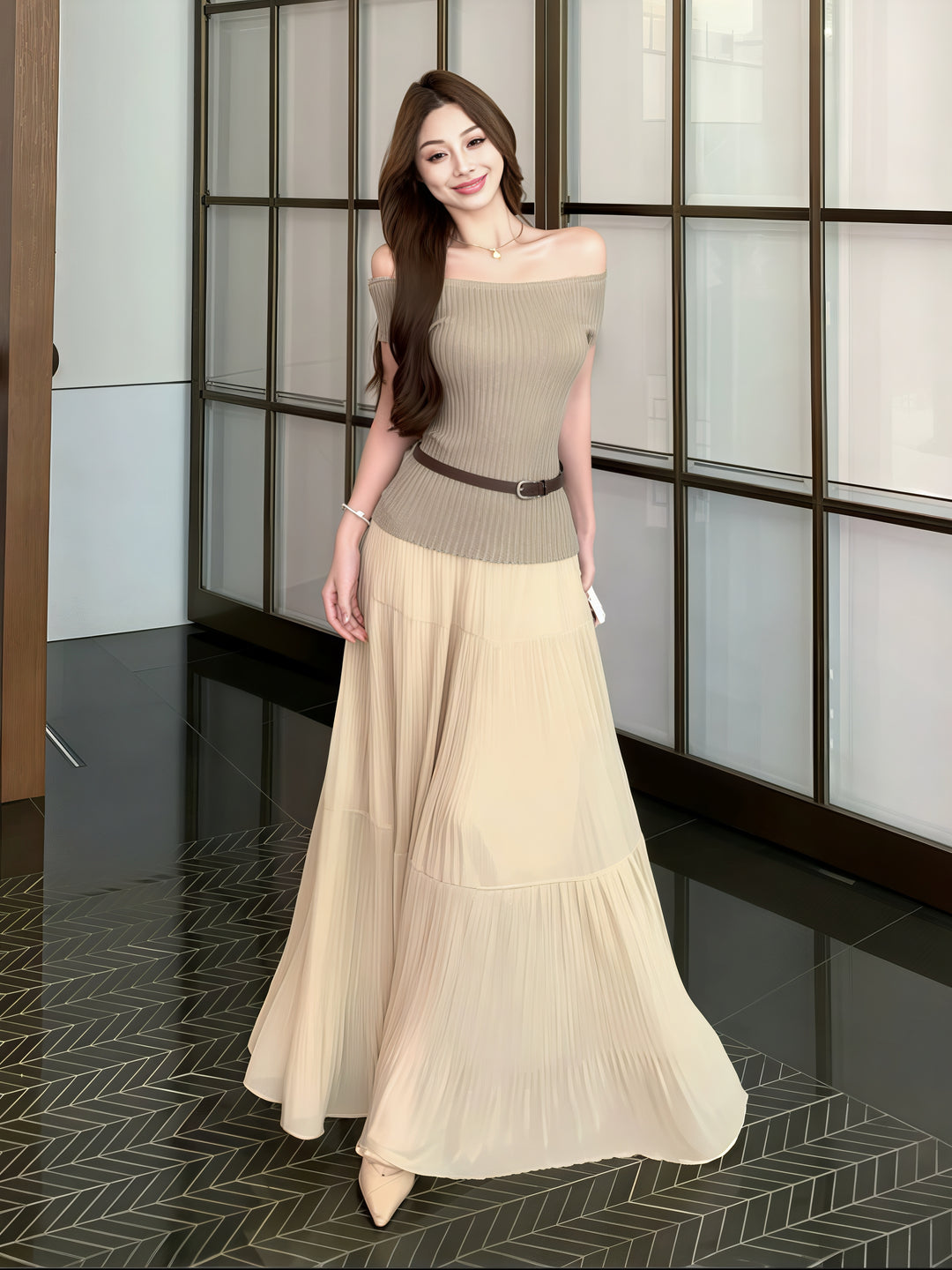 露肩修身针织T恤和高腰A字长裙套装——夏季两件套