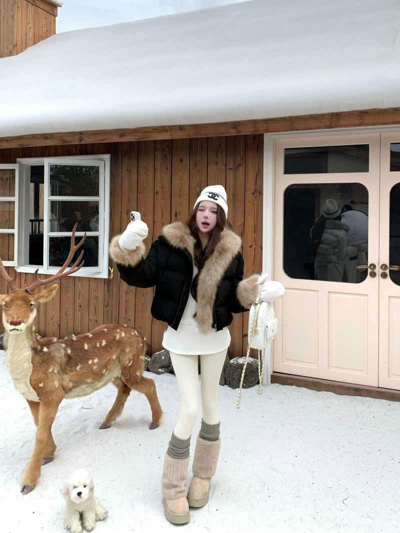 This thickened puffer jacket features a luxurious faux-fur collar and cuffs, creating an elegant and cozy Korean winter look. The short silhouette enhances your body lines while maintaining full warmth, making it perfect for snowy destinations, café outfits, or everyday winter street style.
